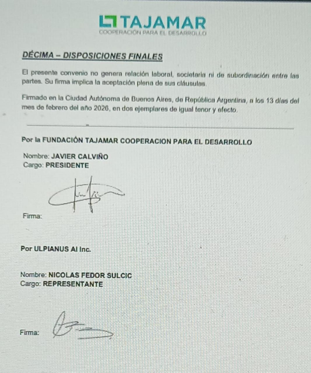 Fundación Tajamar Cooperación para el Desarrollo – Ulpianus AI Corporation La Fundación Tajamar Cooperación para el Desarrollo, representada por su presidente Javier Calviño Pazos y Daniel Alejandro Lopreiato director financiero y Ulpianus AI Inc., sociedad constituida en el Estado de Delaware (EE.UU.) y representada en Argentina por Nicolás Fedor Sulcic, han suscripto un Convenio Marco de Cooperación orientado a promover proyectos conjuntos en materia de innovación tecnológica, inteligencia artificial, educación y sostenibilidad. Este acuerdo estratégico establece las bases para: ▪️ Impulsar procesos de transformación digital en instituciones públicas y privadas. ▪️ Desarrollar e implementar sistemas de inteligencia artificial ética, auditable y alineada a estándares internacionales (EU AI Act, EUDR, ISO/IEC 42001). ▪️ Promover programas de educación, alfabetización digital y formación en tecnologías emergentes. ▪️ Diseñar soluciones innovadoras para la gobernanza ambiental, climática y legal. ▪️ Fortalecer capacidades institucionales con enfoque en impacto social, inclusión y desarrollo sostenible. La articulación entre sociedad civil organizada y empresas tecnológicas especializadas consolida un modelo de cooperación que integra conocimiento, innovación y compromiso ético, contribuyendo a la modernización institucional y al desarrollo sostenible en América Latina. Este Convenio Marco refleja una visión compartida: poner la tecnología al servicio del bien común, bajo principios de transparencia, legalidad y responsabilidad social. www.tajamar.org/novedades #CooperaciónInternacional #InteligenciaArtificial #InnovaciónPública #Sostenibilidad #TransformaciónDigital #Gobernanza #Argentina #EstadosUnidos